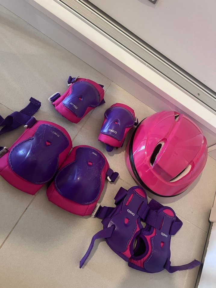 Mor ve pembe renklerde, cırt cırtlı bağlamaya sahip kız çocukları için koruma seti, kask ve dizlik, dirseklik gibi pedleri içerir. ️