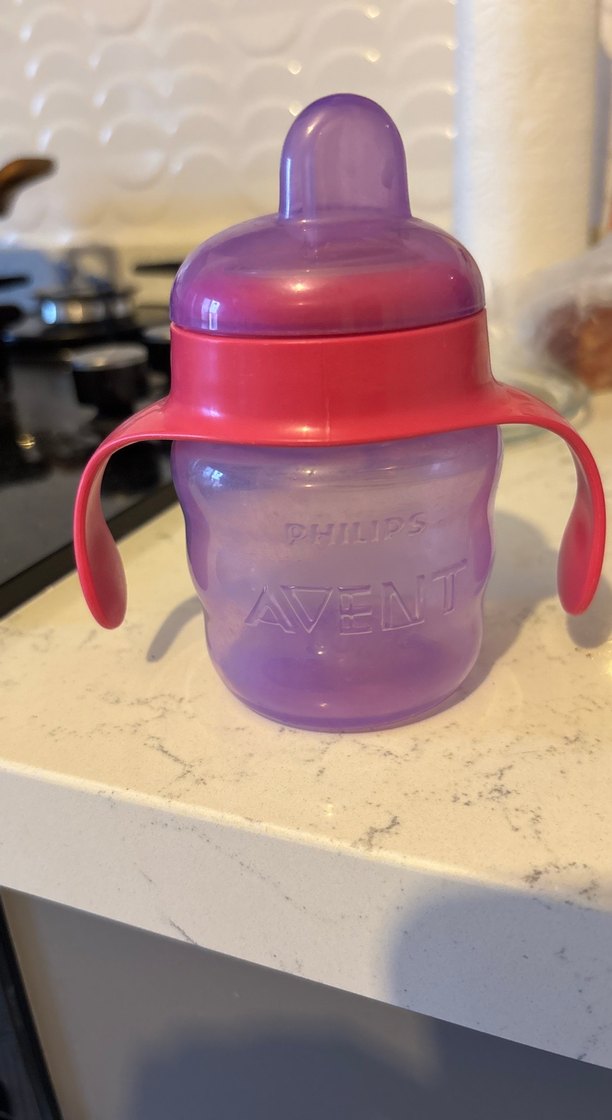 Kolay tutuşlu kulplara sahip mor Philips Avent bebek biberonu. Rahat besleme için tasarlanmıştır.