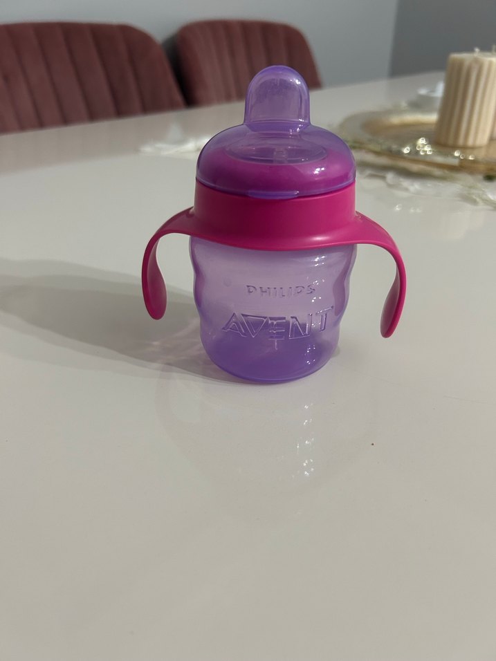 Renkli mor Philips Avent bebek biberonu, kolay tutuş için kulplu ve rahat besleme için yumuşak emzikli.