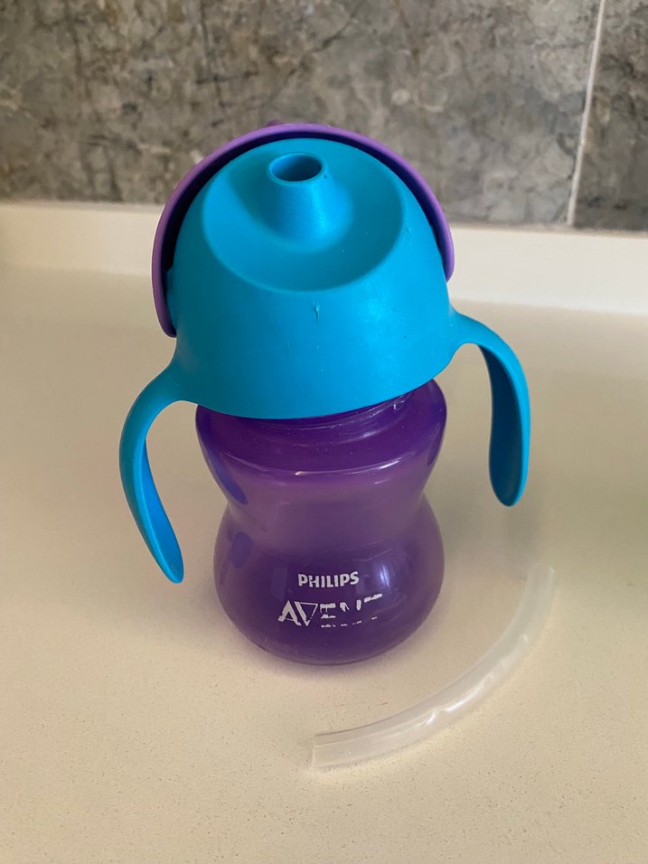 Renkli mor Philips bebek biberonu, kolay içim için saplı mavi kapak . Ağız kısmı yoktur. Yeşillerin ağız pipeti oluyor . Çizikleri vardır