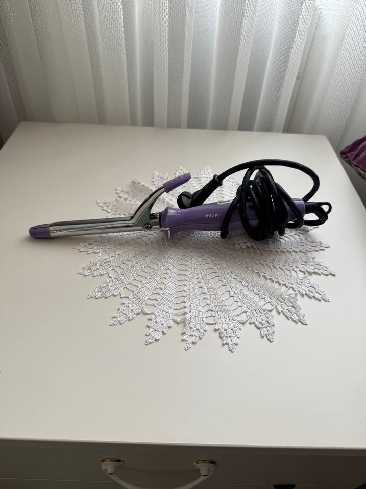 Philips mor saç maşası, metal varilli ve maşa tutuculu, siyah kablolu saç şekillendirici.