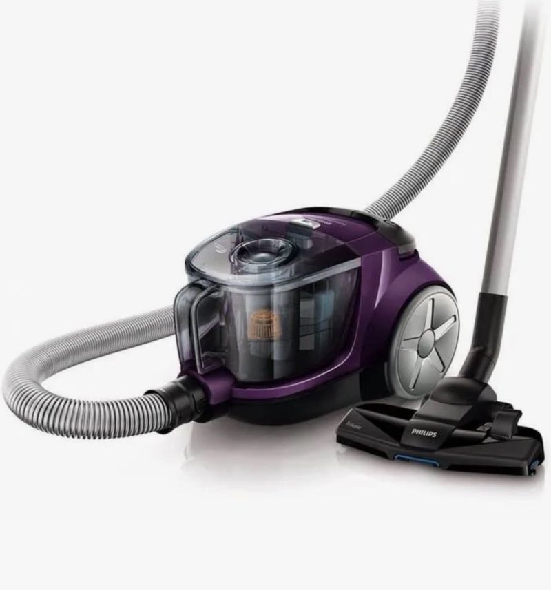 Mor renkli Philips toz torbasız elektrikli süpürge, esnek hortum ve büyük tekerleklerle kolay kullanım sağlar. Dikey süpürge aldığım için ihtiyaç fazlası hiçbir sorunu yok