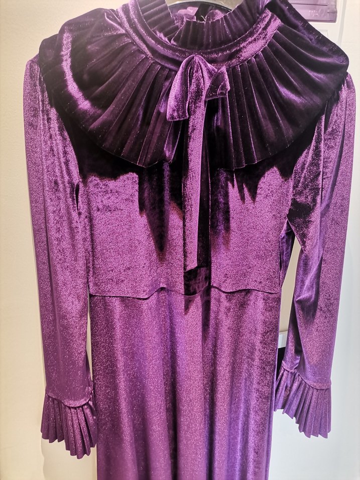 Bu mor pileli uzun elbise, yüksek yakalı ve uzun kollu, vücuda oturan kesime sahiptir. Sentetik kumaştan yapılmıştır ve gotik, avangard tarzlar için uygundur.