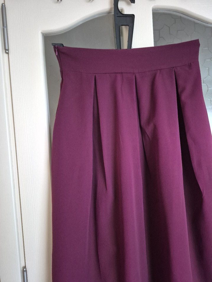 Mor renkli, pileli ve uzun kesim kadın eteği, bol ve sentetik kumaştan üretilmiştir. Ofis için minimalist tarzda uygundur.