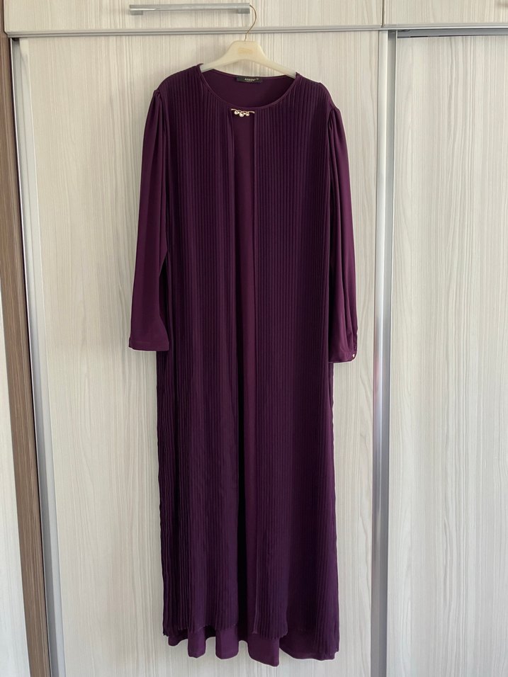 Mor renkli, pileli, uzun kollu ve yuvarlak yakalı, uzun ve bol kesim kadın tesettür büyük beden gece elbisesi bir kere giyilmiştir