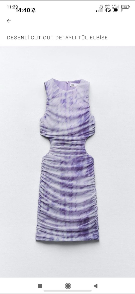 Kolsuz, pilili detaylara ve V yakaya sahip, pastel mor bağlama desenli, vücuda oturan midi elbise.