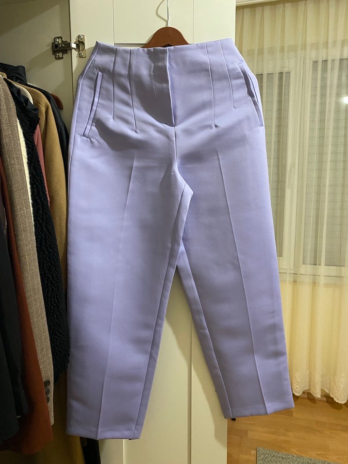 Mor renkli, ipeksi kumaştan üretilmiş, pilili ve midi boyda, normal kesim kadın pantolonu. Ofis için şık ve yenilikçi bir tarz sunar.
