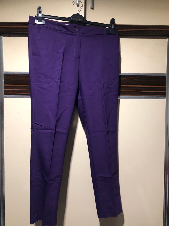Mor renkli, pilili, midi boy kumaş pantolon. Normal kesim ve parlak görünümlü, iş ve günlük stil için uygundur. ✨
