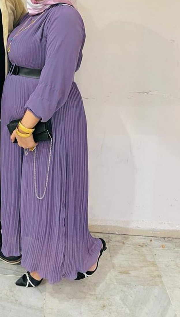 Nowan markalı mor midi elbise, pilili detaylara ve tekne yakaya sahip bol kesimdir. İpek gibi kumaştan, uzun kollu ve vintage baskılı, ofis için uygun.