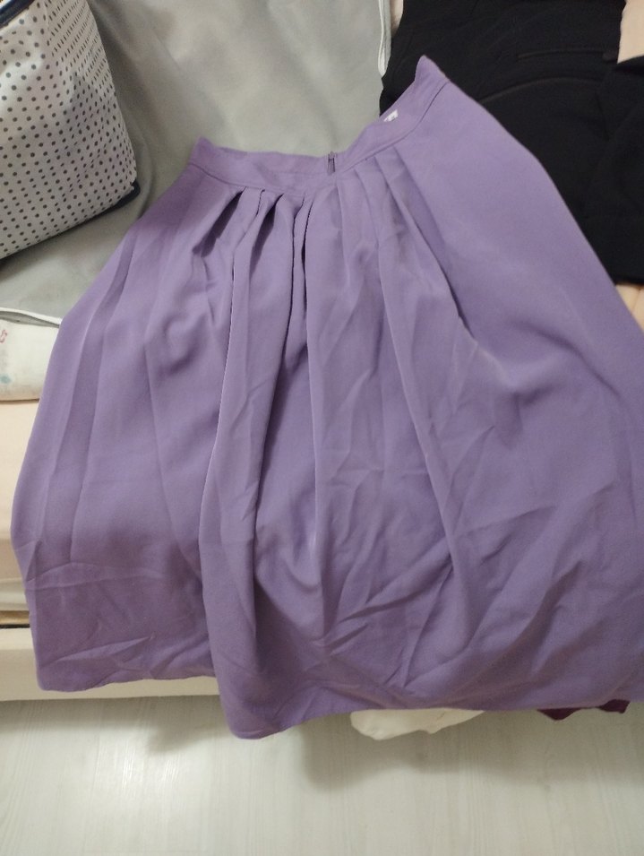 Mor renkte, pilili ve midi boyda, yumuşak ve ipeksi kumaştan yapılmış bol kesim etek. Ofis için minimalist tarzda uygundur.