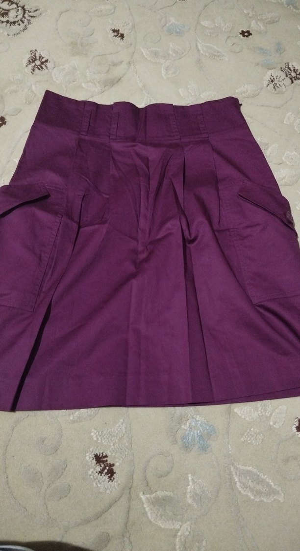 Koyu mor renkli etek, pilili ve bol kesimdir. Sentetik kumaştan yapılmıştır, düz ve desensizdir, günlük sokak stiline uygundur.