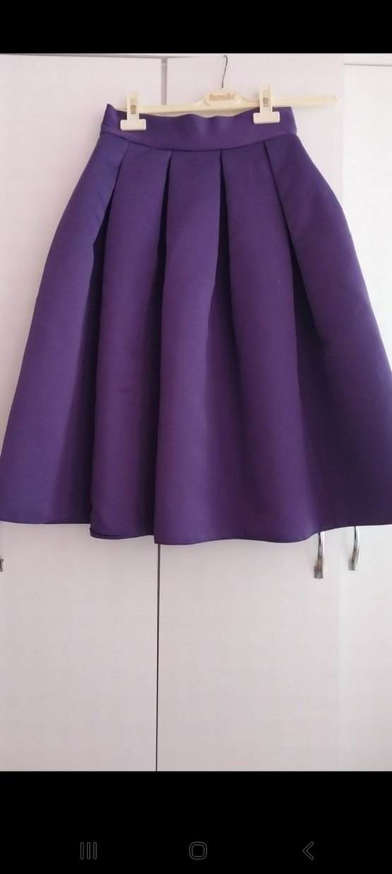 Parlak mor renkte, pilili ve bol kesim midi uzunluğunda kadın eteği. Pürüzsüz sentetik kumaştan, günlük kullanım için uygundur.