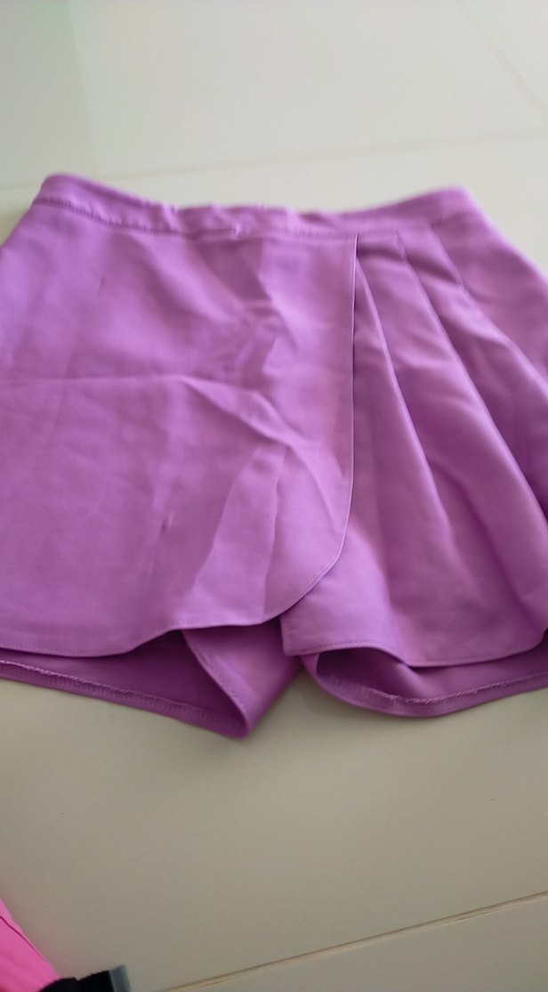 Mor renkte, pilili ve satenimsi dokulu, bol kesim mini hamile şortu, pastel ve minimalist sokak giyimi tarzında günlük kullanım için uygundur.
