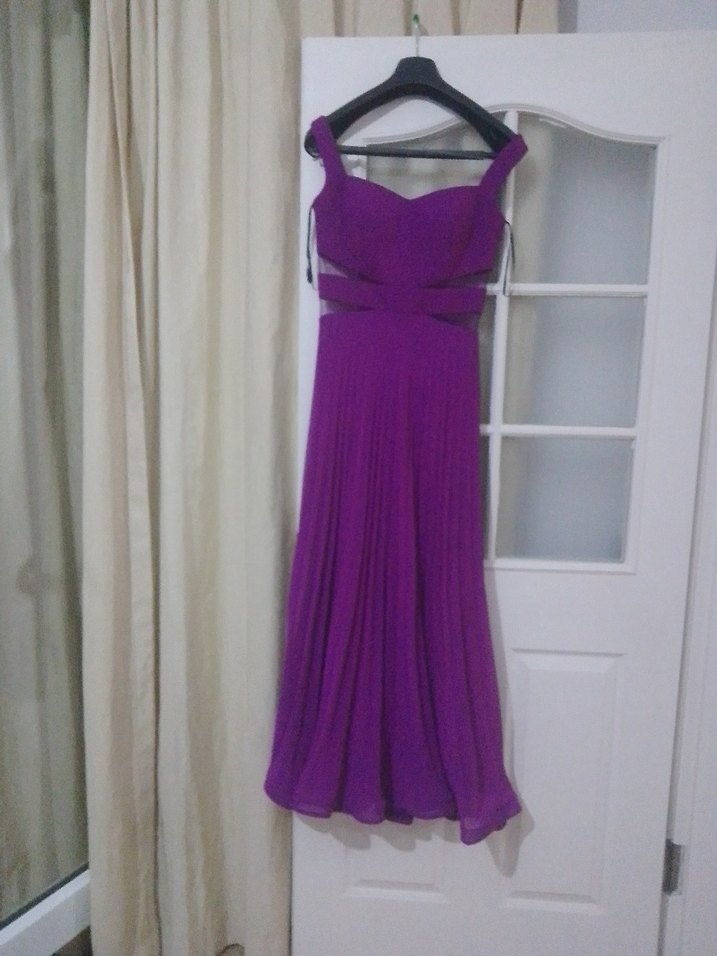 Mor renkte, pilili detaylara sahip uzun abiye elbise. Askılı ve straplez yaka modeli ile fit kesim sunar. Düğün için uygundur. sadece 1 kere giyildi. mükemmel bir kalıbı ve kumaşı vardır . hiçbir kusuru yoktur.