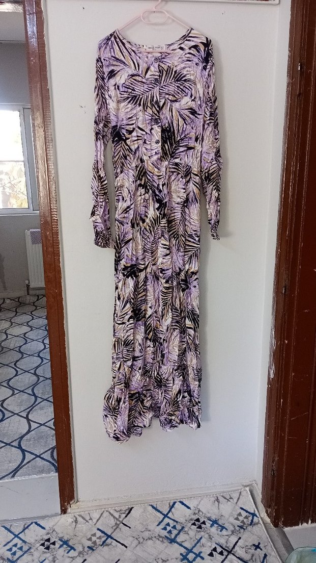 Mor renkli, pilili ve salaş kesimli uzun elbise. Tekne yaka ve uzun kollu, sentetik kumaştan üretilmiştir. Günlük kullanıma uygundur.