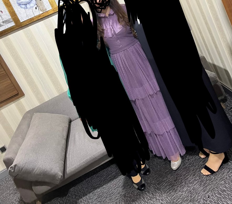 Mor, pilili, uzun ve vücuda oturan bu elbise yüksek yakalı ve askılıdır. Sentetik kumaştan üretilmiş, desenli ve avant-garde parti tarzına uygundur.