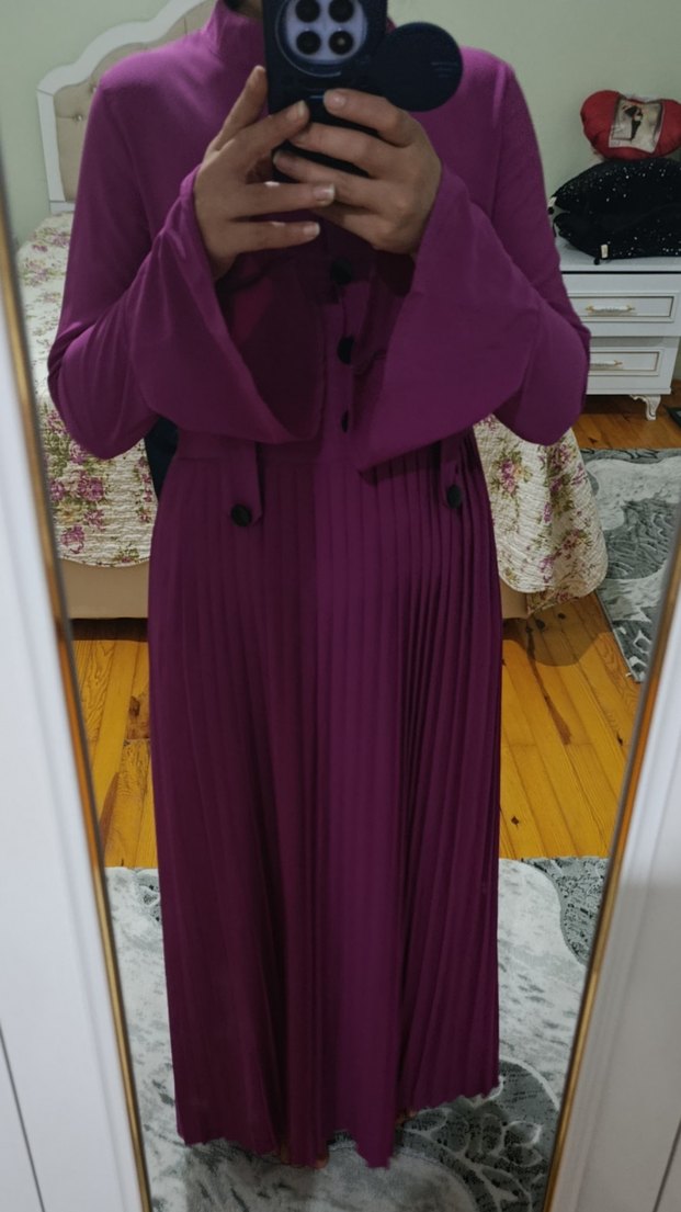 Mor renkli, pilili ve uzun kollu, notched lapel yaka detaylı bol kesim kadın elbisesi. Yumuşak sentetik kumaştan, sade tasarım.sadece bir düğmesi yok