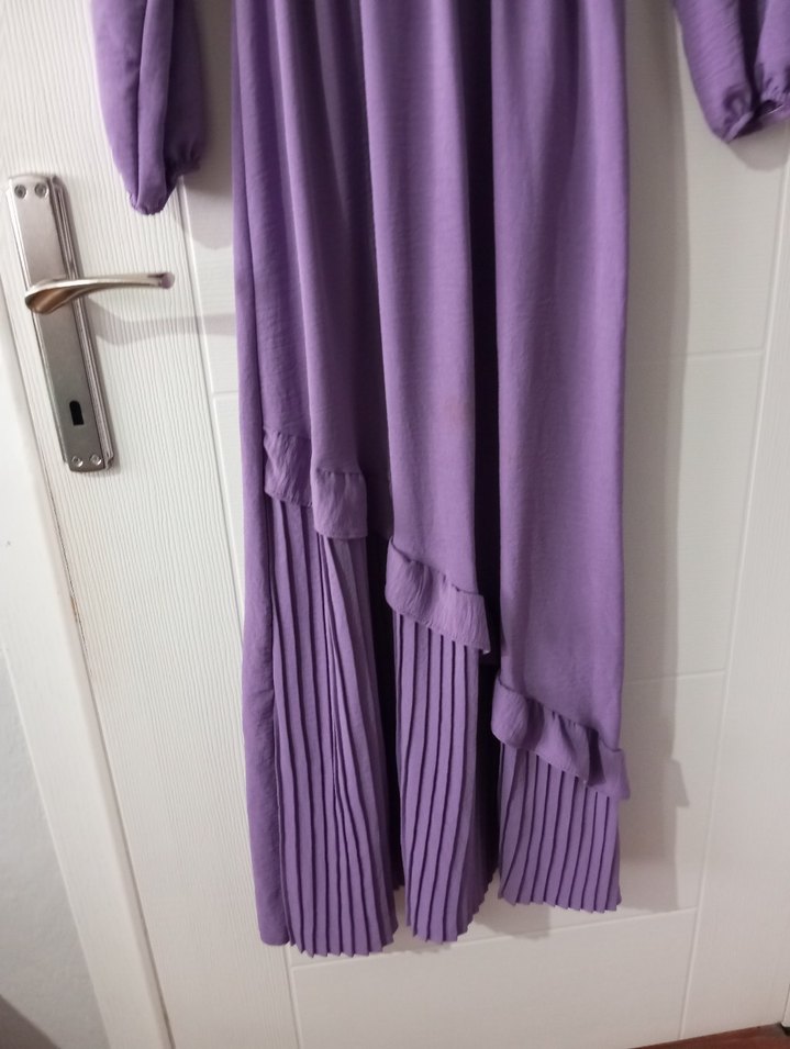 Mor renkli, pilili detaylara ve kesik yaka yakaya sahip uzun kollu, bol kesim uzun elbise. Günlük kullanıma uygun, sentetik kumaştan üretilmiştir.