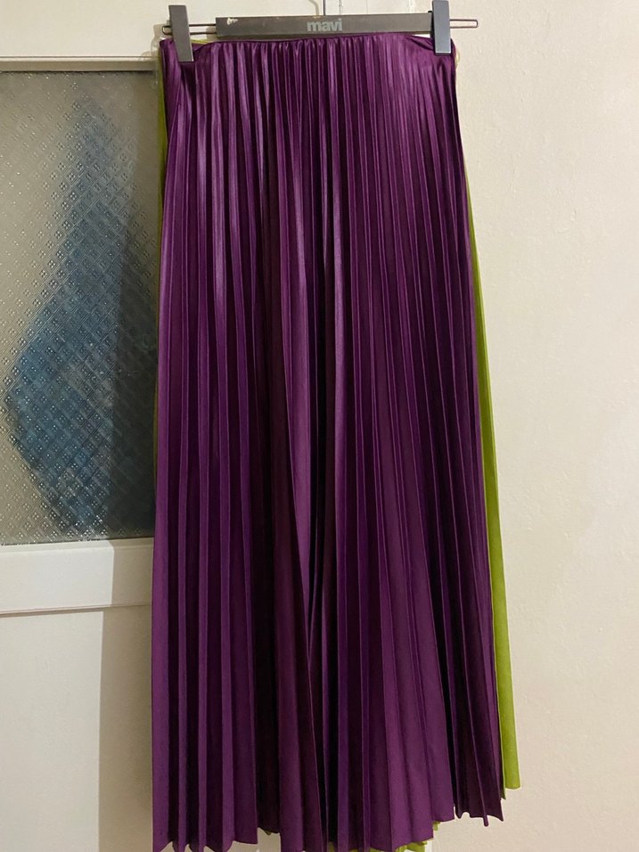 Mor renkte pilili, uzun ve bol kesim kadın eteği. Sentetik kumaştan yapılmış, çağdaş bağlama desenli, parti için uygun şık bir parça.