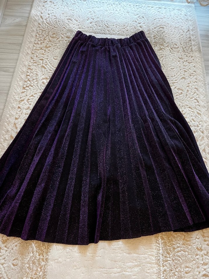 Mor renkte, pilili ve bol kesim uzun kadın eteği. Yumuşak sentetik kumaştan yapılmıştır, gotik ve bohem tarzlara uygundur.