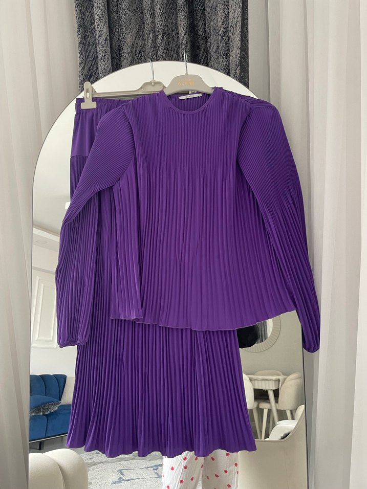 Mor renkte, pilili uzun kollu ve yuvarlak yakalı, yumuşak sentetik kumaştan üretilmiş bol kesim kadın elbisesi. Günlük kullanım için uygundur.