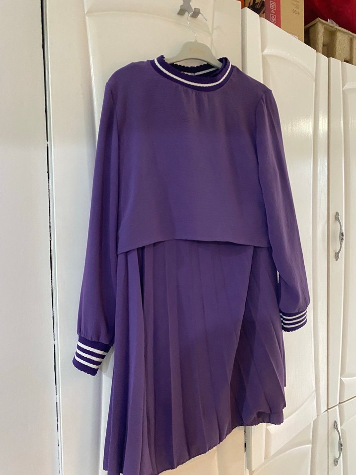 Mor, uzun boylu, pilili, yüksek yakalı ve çizgili manşetli uzun kollu bol kesim kadın etek takım