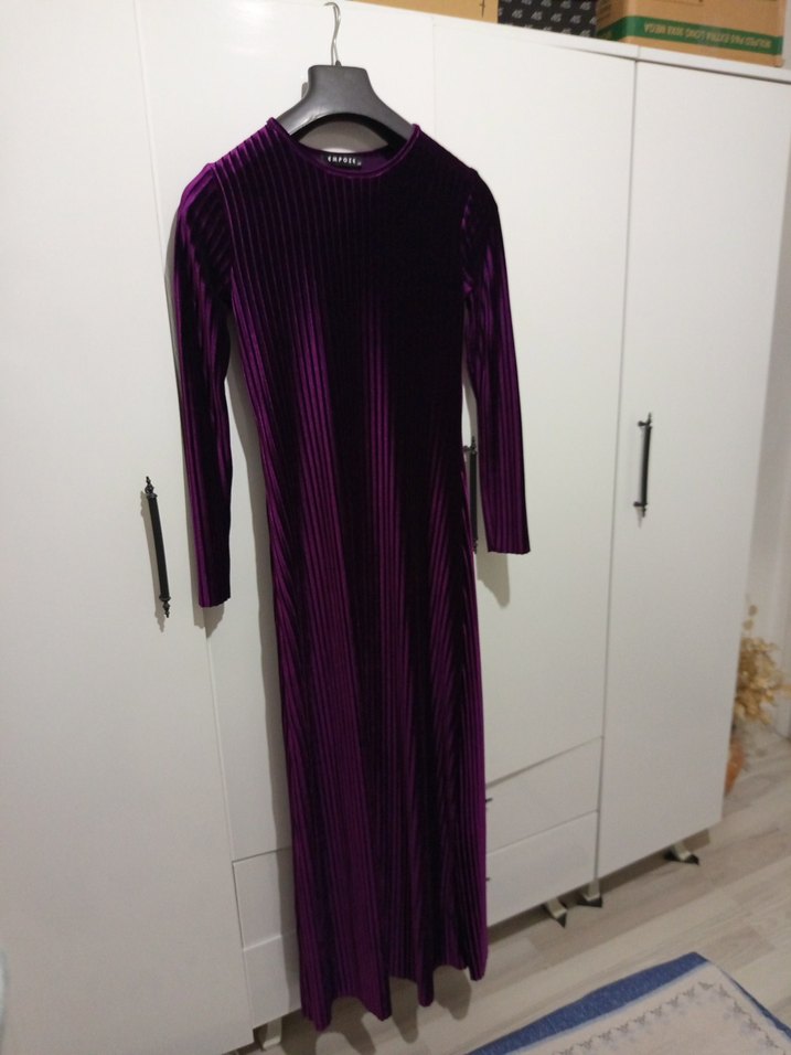 Mor tonlarında, yüksek yakalı, uzun kollu, pilili dokusu olan ve sentetik kumaştan üretilmiş dar kesim uzun elbise.