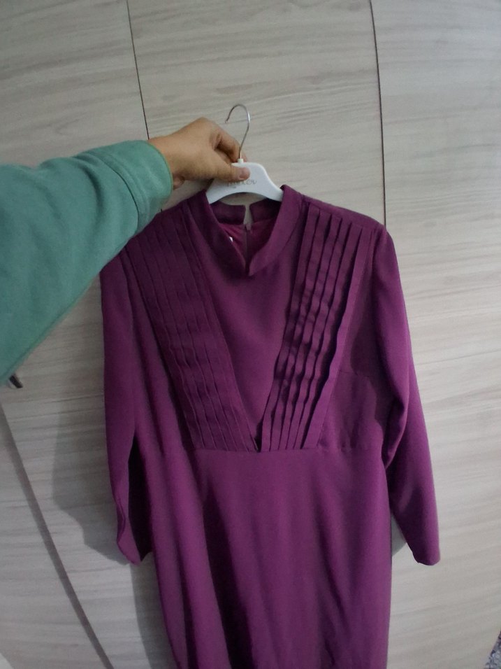 Mor renkli, pilili yüksek yakalı elbise Uzun kollu, bol kesim ve ipeksi dokusuyla gündelik kullanıma uygun minimalist normcore tarzda.