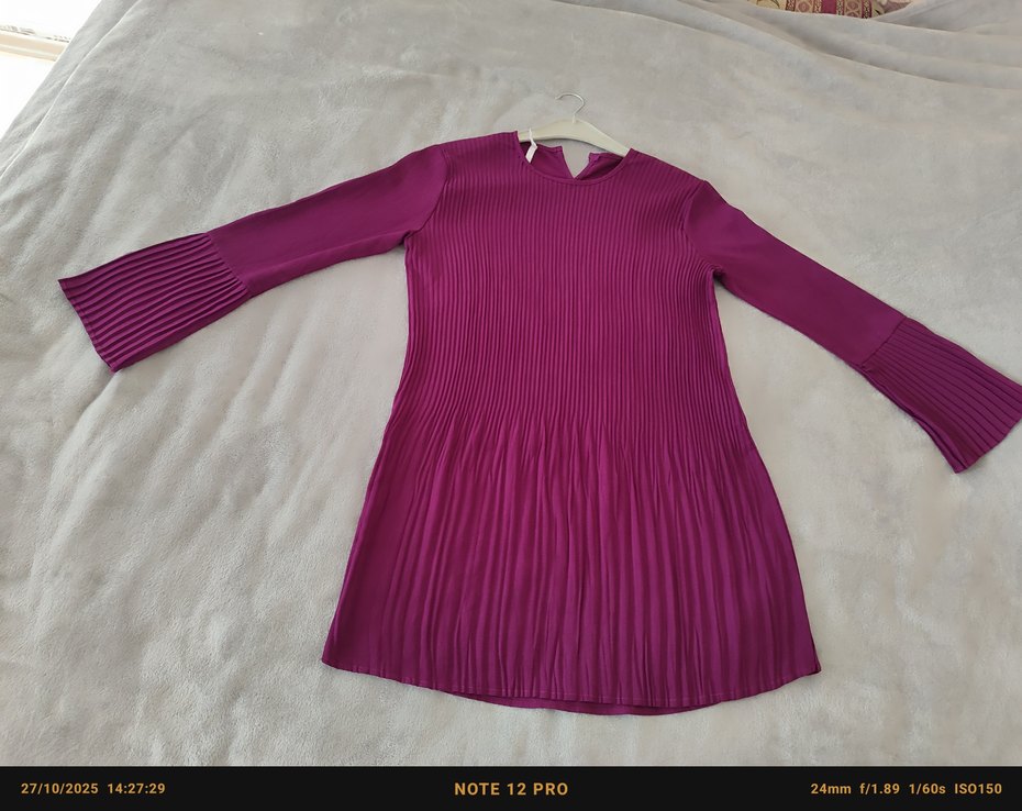 Mor renkli, piliseli detaylara sahip, yuvarlak yakalı ve uzun kollu dar kesim kadın tunik. Pürüzsüz sentetik kumaştan, minimalist ve renkli bir stil sunar.