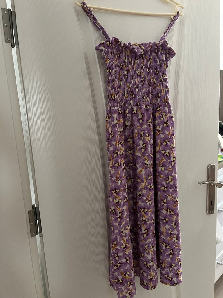 Mor piliseli uzun elbise, askılı ve straplez yakalıdır. Pastel tonlarda tie-dye deseni ve bol kesimiyle bohem tarzı yansıtır.