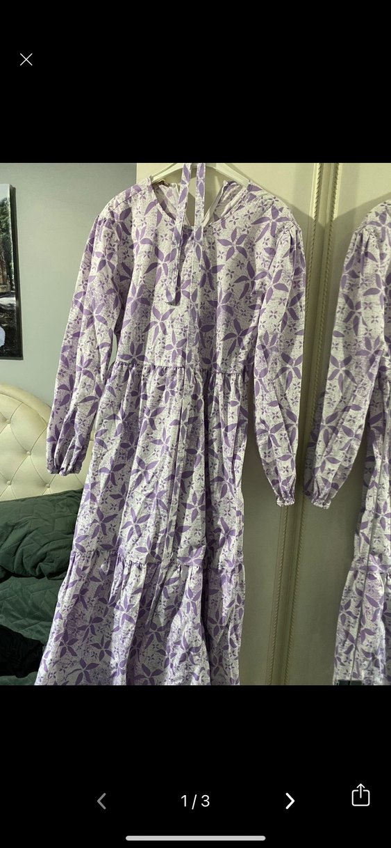Piliseli detaylı, uzun kollu, yüksek yakalı bol kesim uzun elbise. Pastel mor tie-dye desenli, bohem tarzda. Yumuşak dokulu tekstil kumaştan, günlük kullanım için uygun.