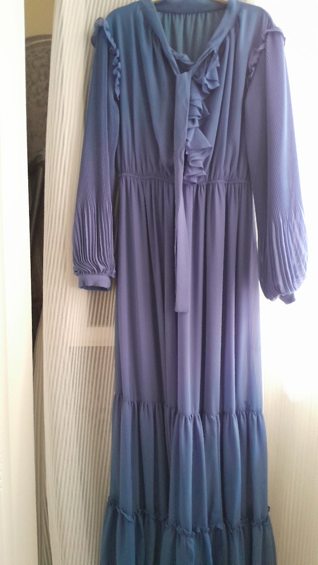 Mor piliseli uzun elbise, yüksek yakalı ve bol kesimlidir. Yumuşak sentetik kumaştan yapılmıştır, ofis için bohem tarzda uygundur.