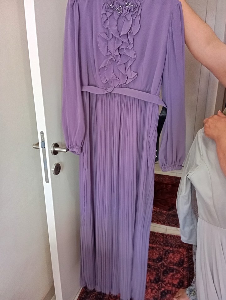Mor renkte, uzun kollu ve piliseli detaylara sahip uzun abiye elbise. Yüksek yakalı ve bol kesim, vintage ve modern klasik tarzı bir arada sunar. Bir kere giyildi