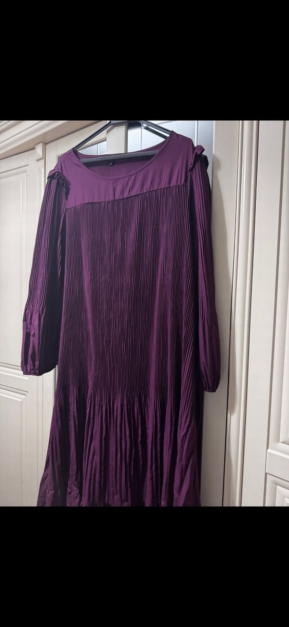 Mor renkte, piliseli ve ipeksi kumaştan uzun, bol kesim elbise. Uzun kollu ve bisiklet yaka özellikleriyle gotik tarzı yansıtır.