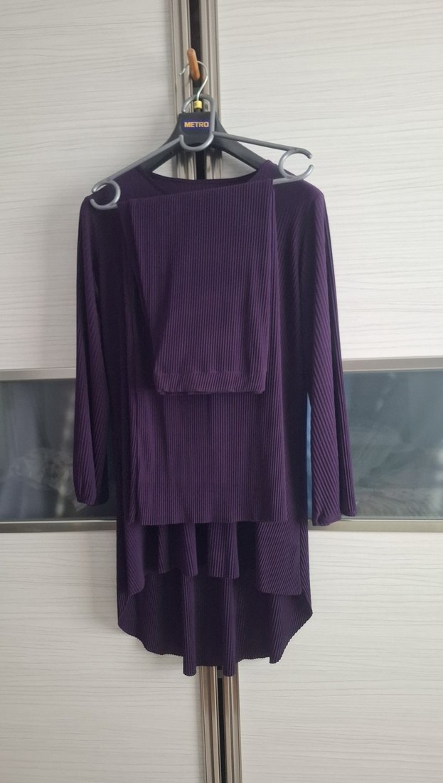 Koyu mor renkte, piliseli detaylara sahip, uzun kollu ve yuvarlak yakalı, sentetik kumaştan üretilmiş bol kesim uzun tunik ve düz kesim etekli takım Günlük ve Özel günlerde kullanım için uygundur.ŞIK VE KURTARICI BIR TAKIM
