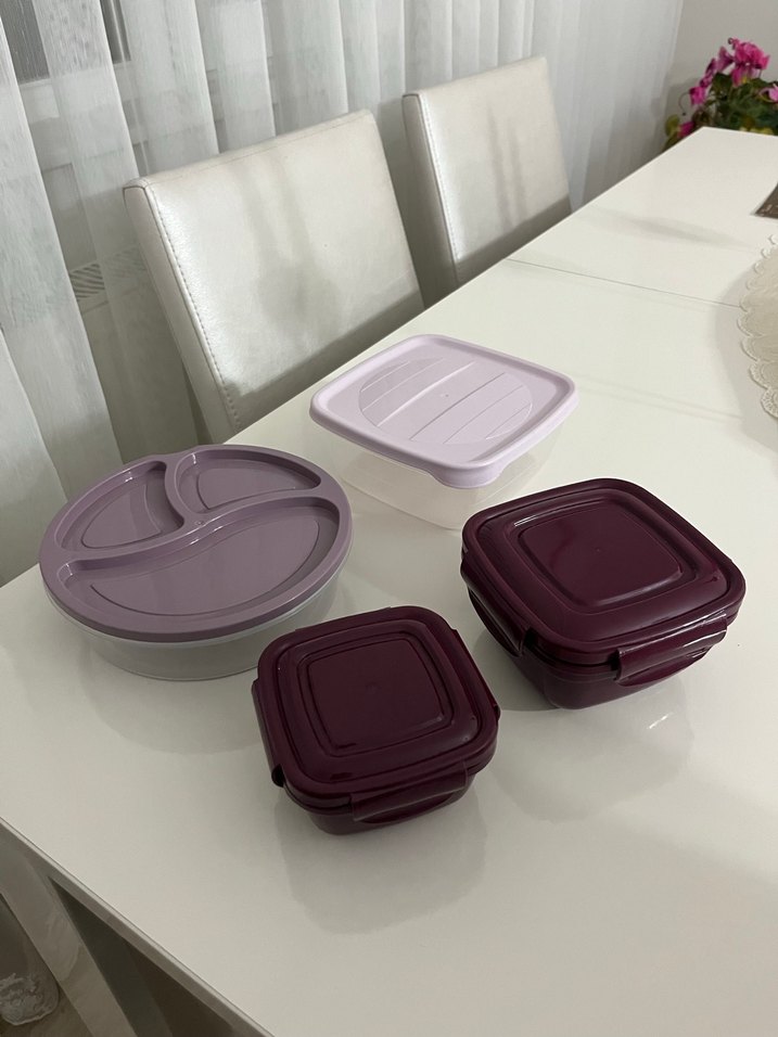 Farklı boyutlarda ve bölmeli seçeneklere sahip mor plastik saklama kapları seti, kolay saklama için güvenli kapaklıdır. Hiç bir sorunları yoktur.