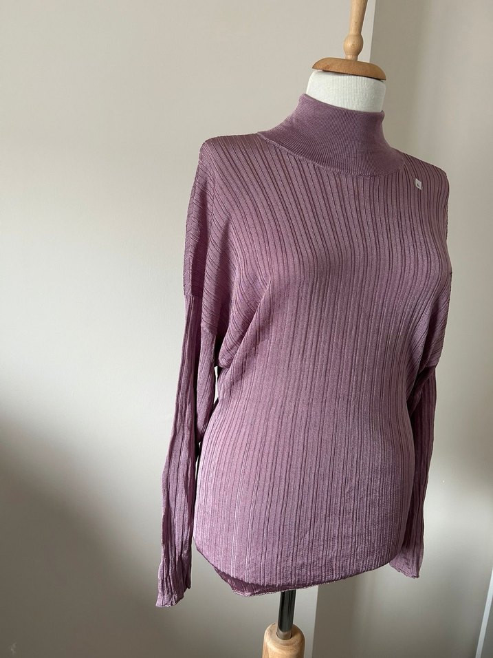 Mor renkli, boğazlı ve uzun kollu kadın trikosudur. Keten kumaştan yapılmış, pliseli dokusu ve normal midi boyu ile rahat bir kesime sahiptir.