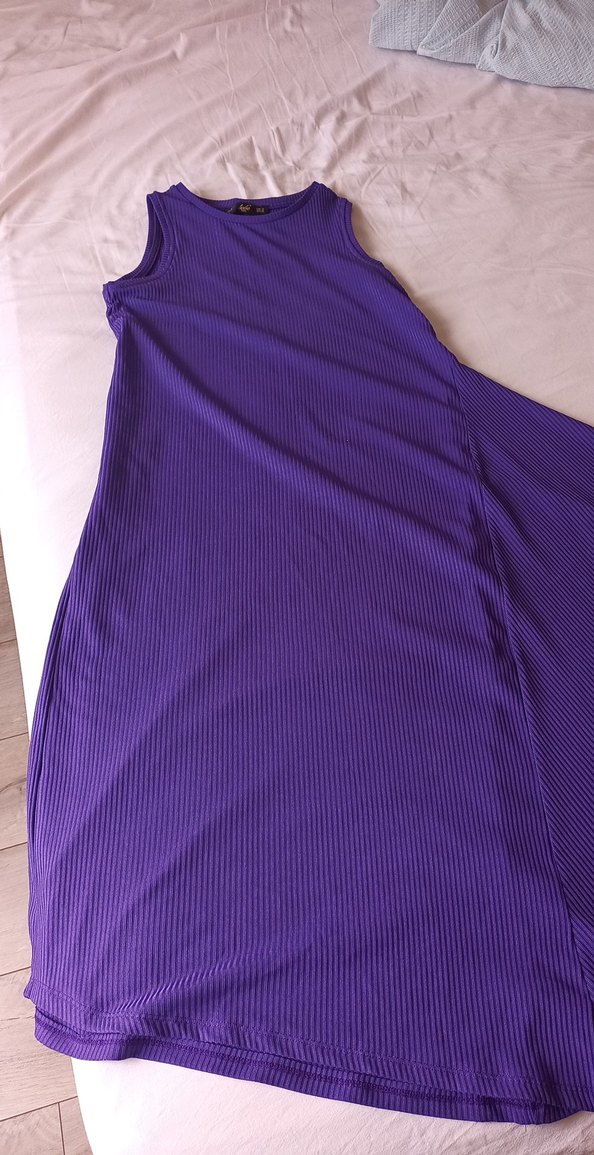 Mor renkli, sentetik kumaştan, bisiklet yakalı ve kolsuz uzun elbise. Pliseli dokusu ve minimal tasarımı ile günlük kullanıma uygun. eteği volanlı