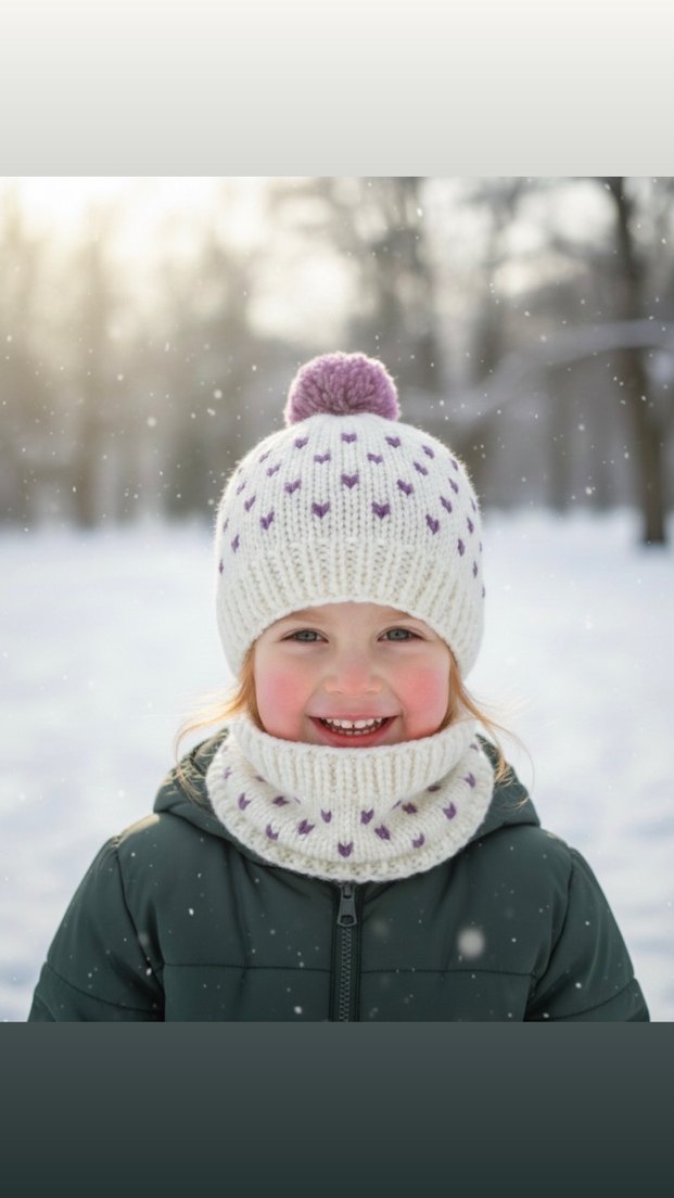 Mor noktalar ve mor ponponlu beyaz örgü bere, rahat ve renkli bohem tarz sunar. İstenilen yaşta ve renkte sipariş alınır