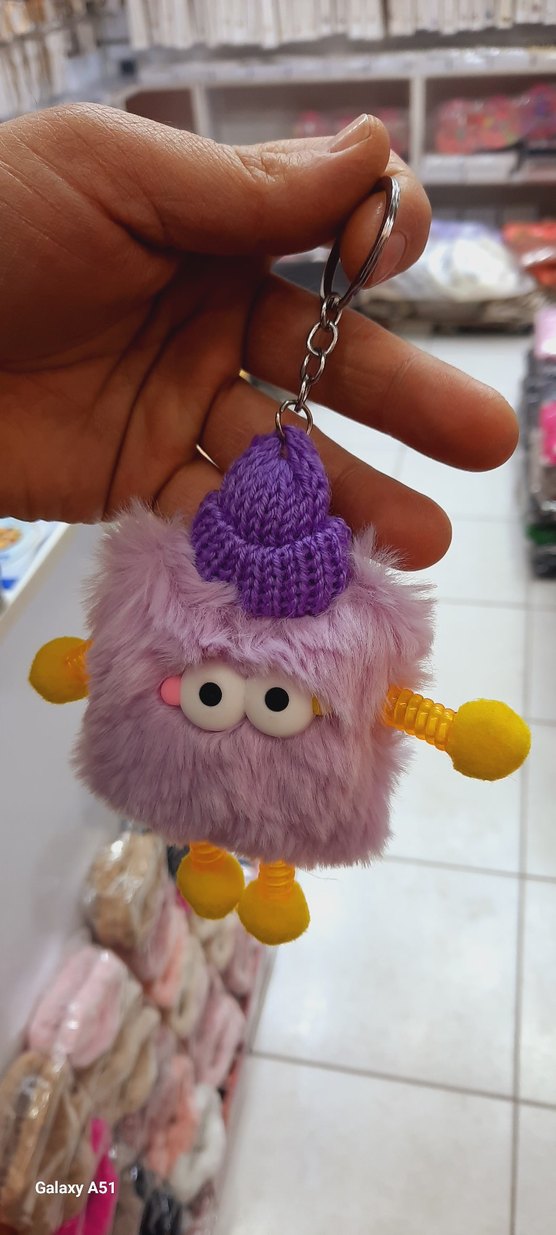 Mor renkli, yumuşak tüylü gövdesi ve örgü şapkalı, püsküllü detaylarıyla rahat ve bohem tarzda kadın anahtarlık.