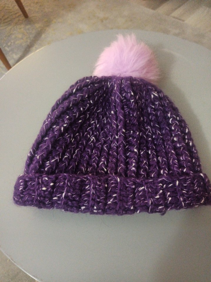 Mor renkli, örgü dokulu kadın bere, üzerinde yumuşak pembe ponpon bulunur. Renkli ve sade bir tarz sunar.