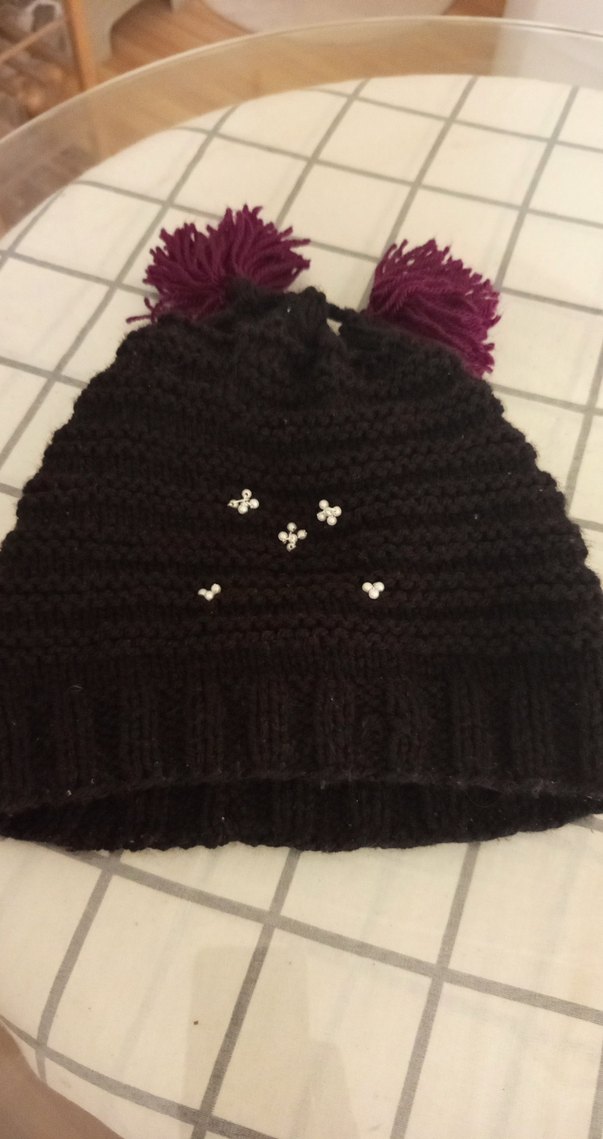 İki ponponlu ve küçük boncuk detaylı koyu mor örgü bere, rahat ve retro gotik tarz sunar. Bohem ve hippie görünüme uygundur.