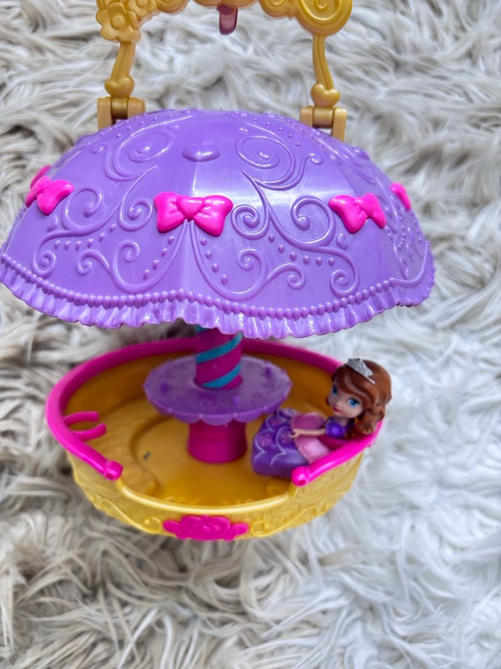 Pastel mor renkte, pembe fiyonk detaylı dönen şemsiye üstü ve içinde küçük bir prenses figürü bulunan sarı tabanlı oyuncak. Orijinaldir lisanslı ürün