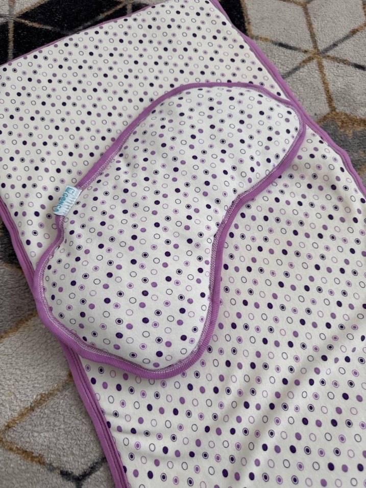 Pastel mor puantiyeli, yumuşak sekumaştan yapılmış çocuk uyku aksesuarı seti, yastığı ve uyku matını içerir. Temizdir bi sorunu yoktur