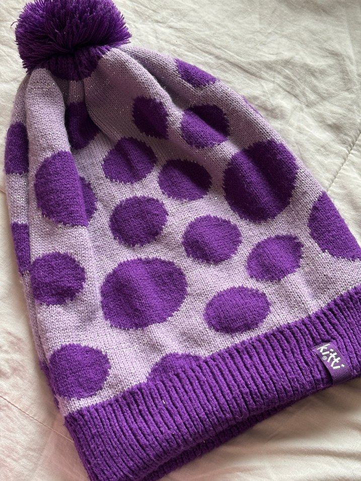 Mor puantiyeli, örgü kumaştan kadın bere, üstünde ponpon detayı ile rahat ve bohem tarz için uygundur.