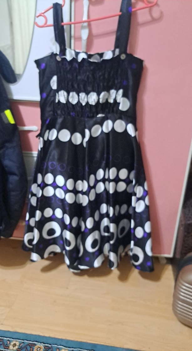 Straplez, bol kesim ve pile detaylı midi elbise, koyu mor puantiyeli yumuşak sentetik kumaştan. Retro goth tarzı için uygun. 10 yaş çocuk