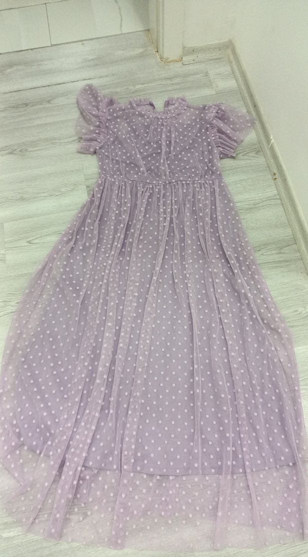 Mor renkte, V yakalı ve kısa fırfırlı kollu uzun elbise. Sentetik kumaştan, pastel puantiyeli desenli ve bol kesimdir. Bohem tarzına uygundur.