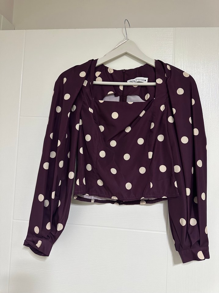 Mor renkte, beyaz puantiyeli kısa kesim, bol kesim bluz. İpeksi kumaştan yapılmış, günlük kullanıma uygun bohem ve retro tarzda.