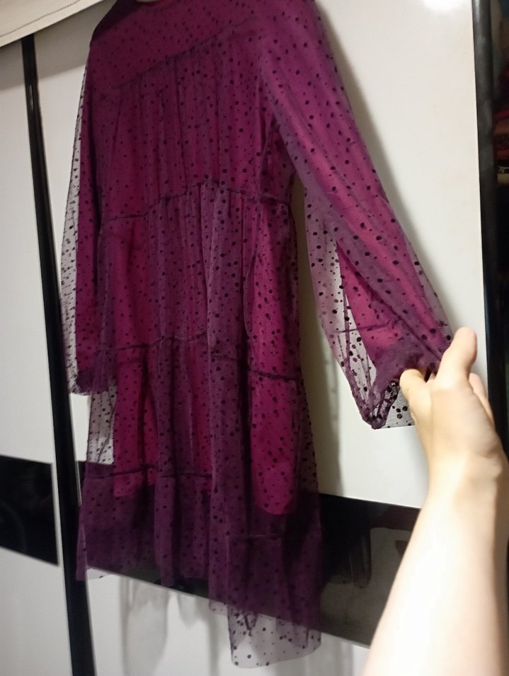 Mor renkte, puantiyeli, uzun kollu ve kat kat fırfırlı tasarıma sahip bol kesim elbise. Yumuşak sentetik kumaştan üretilmiştir, goth tarzına uygundur.1 kere giyilmiştir sıfır gibidir 38 42 beden uyumludur iade yoktur alan kesinlikle memnun kalacaktır yepyeni