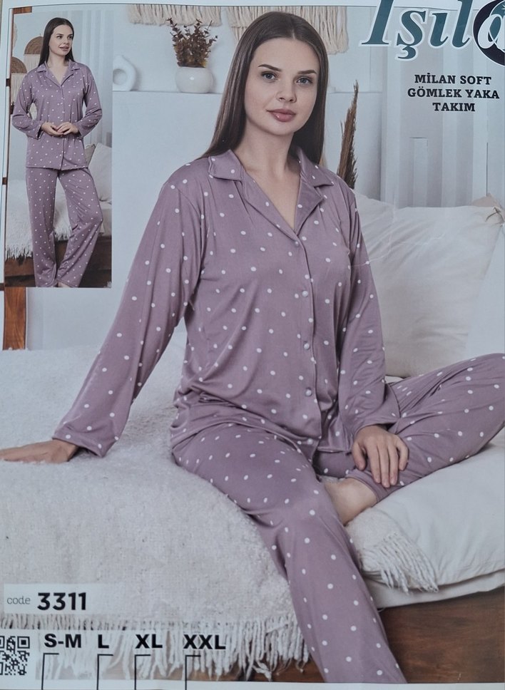 Mor pastel renkte, beyaz puantiyeli uzun kollu gömlek yaka ve bol kesim uzun pantolonlu rahat kadın pijama takımı. Yumuşak kumaşla konfor sağlar.